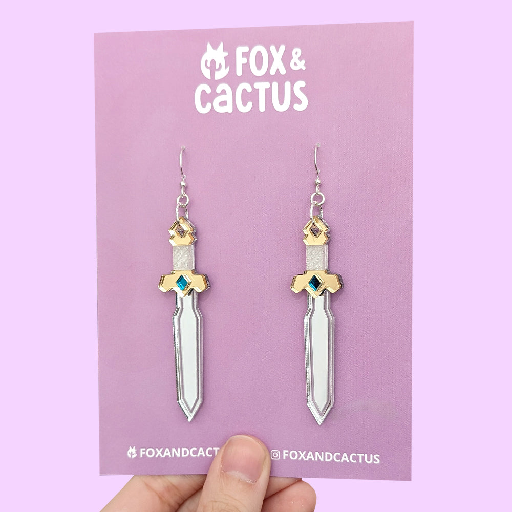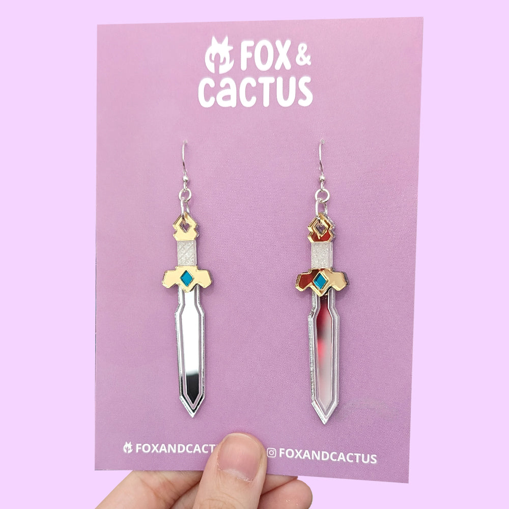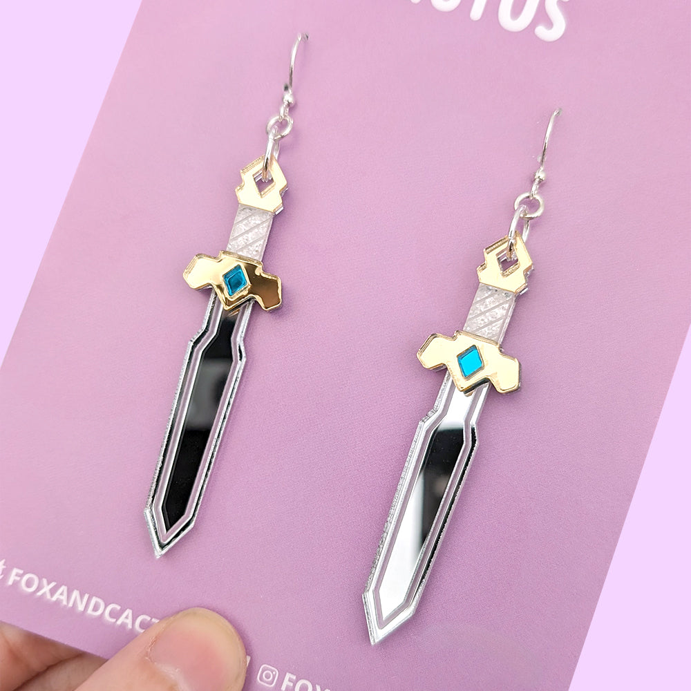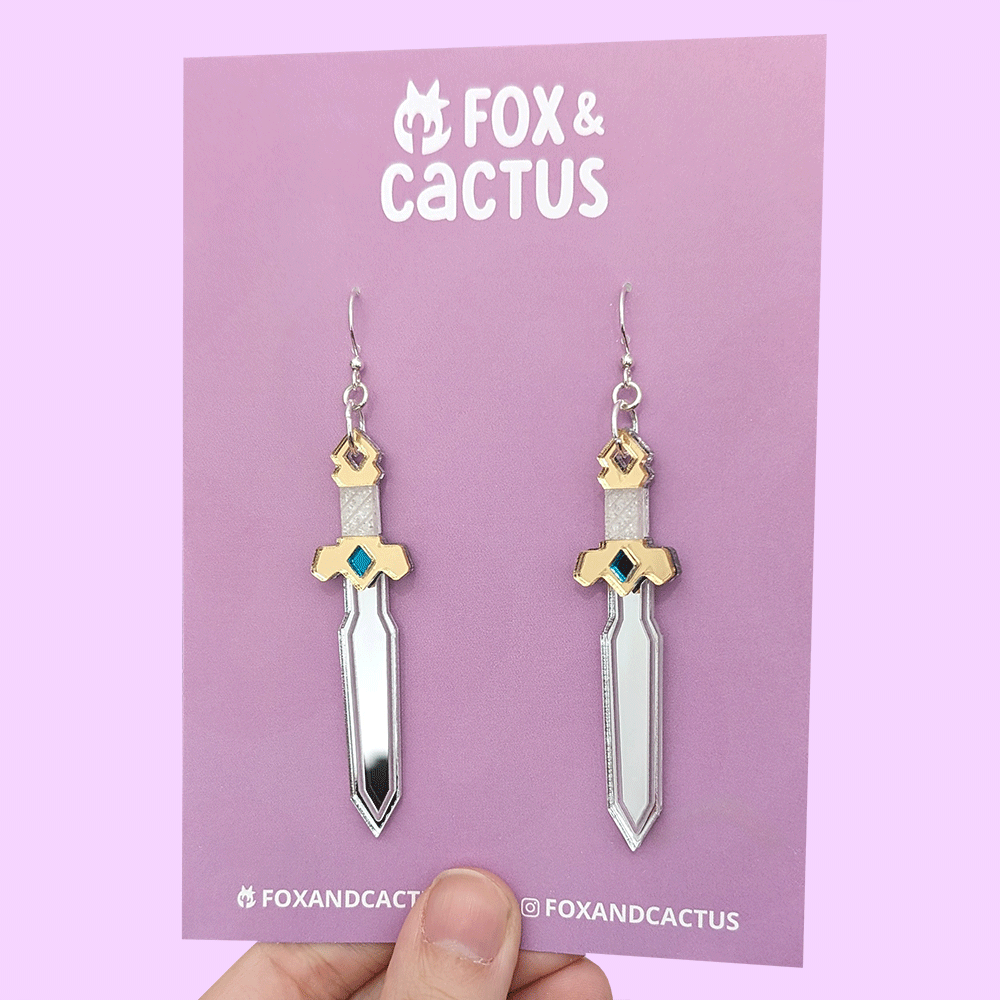 Our Golden Sword earrings feature a silver blade with a stunning golden hilt (with green and glitter white details). Perfect for fantasy book and film fans.