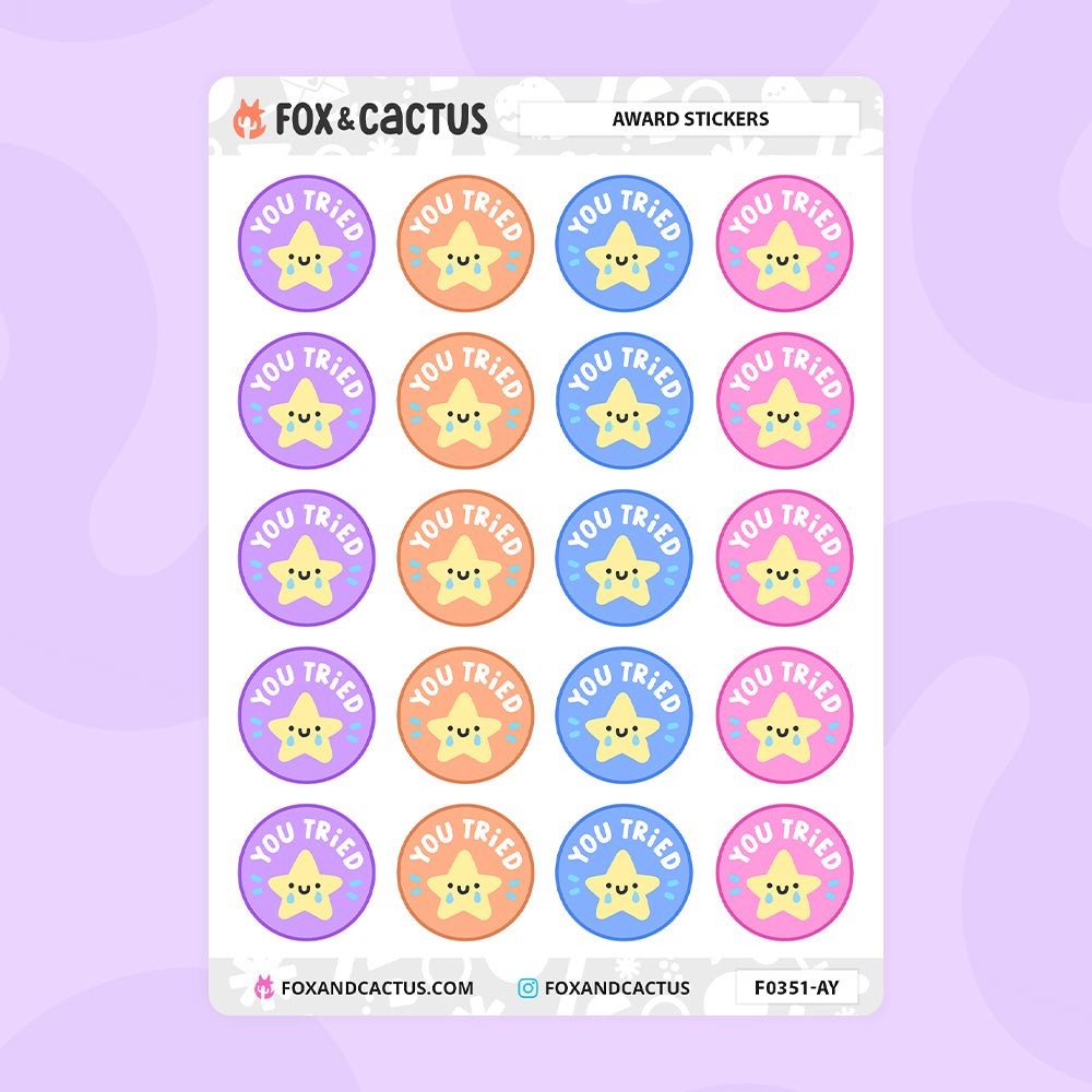 Perfect for marking when you've done something noteworthy (or tried to) in your planner of choice, or anywhere else your heart desires!! Available in mixed designs or ALL "You Tried" and ALL "Nice Work".