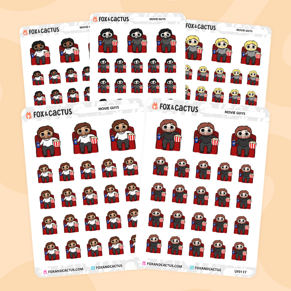 One (1) sheet of Movie Kawaii Guy planner stickers!* (AVAILABLE IN 10 VARIATIONS - PICK YOUR GUY WITH OR WITHOUT BEARD)
