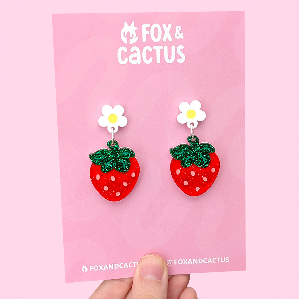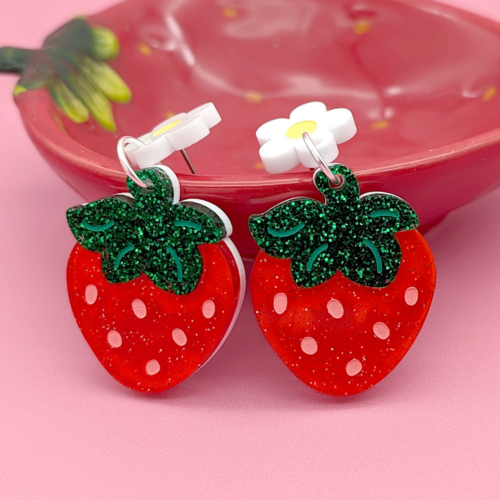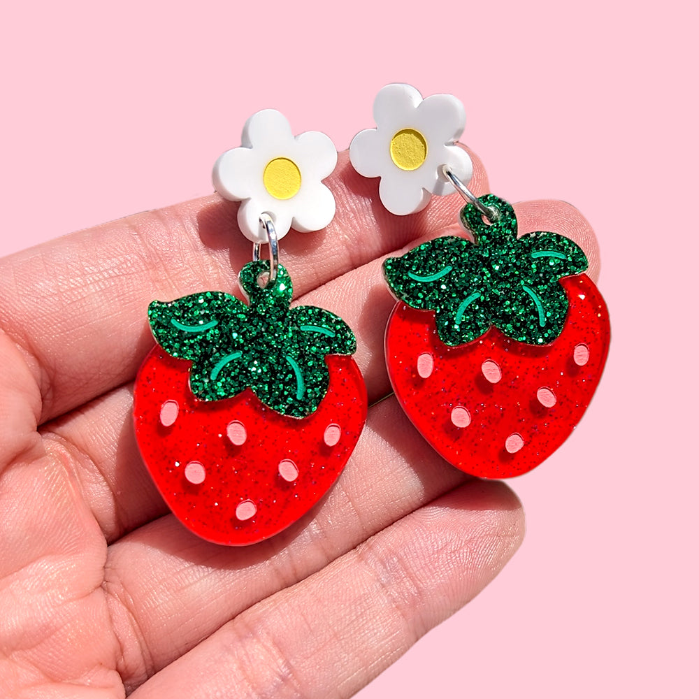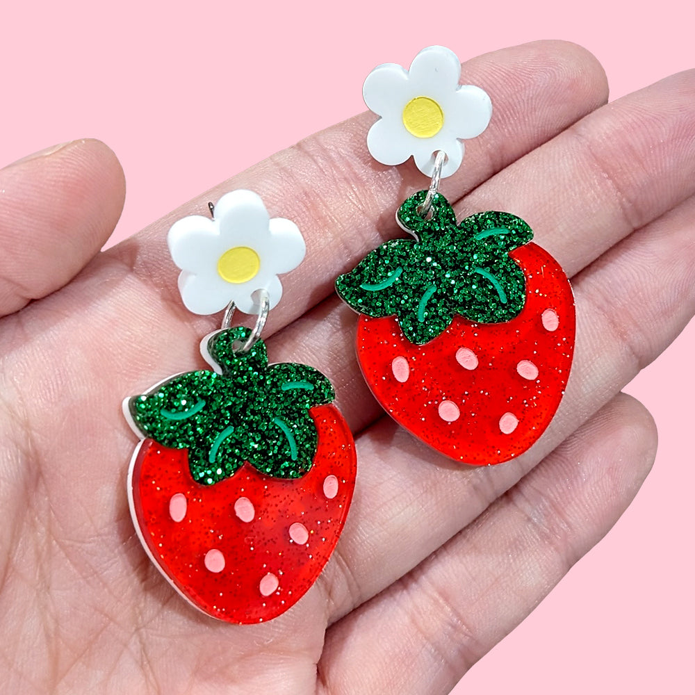 Picked fresh from the garden with love. š These strawberry earrings are topped with an adorable little flower, perfect for plant and fruit lovers!