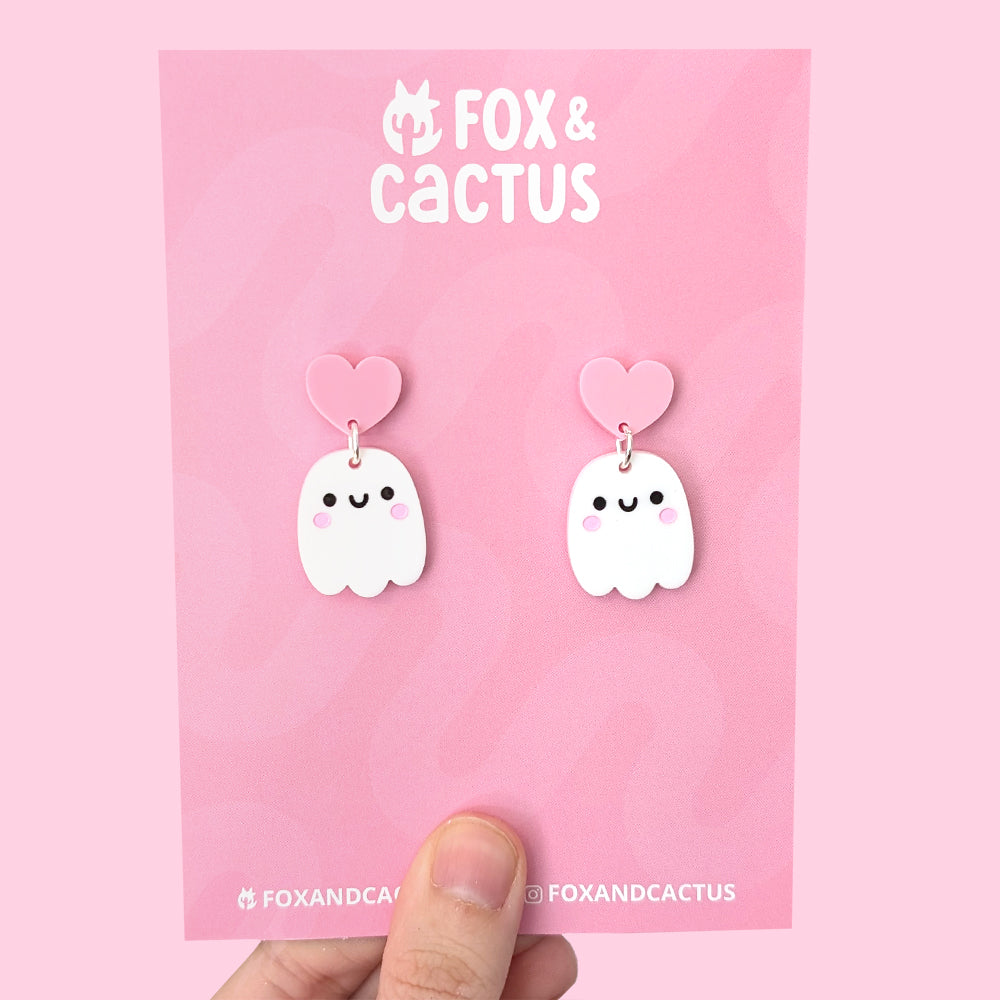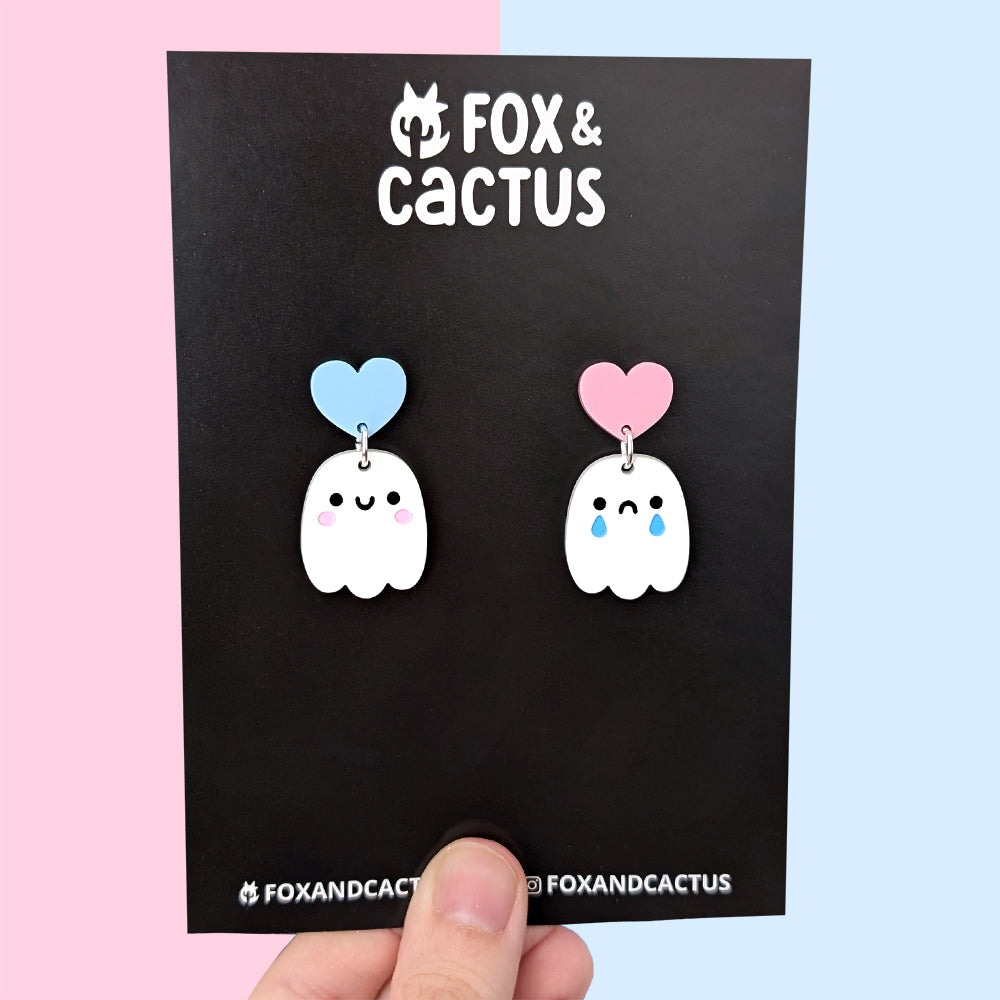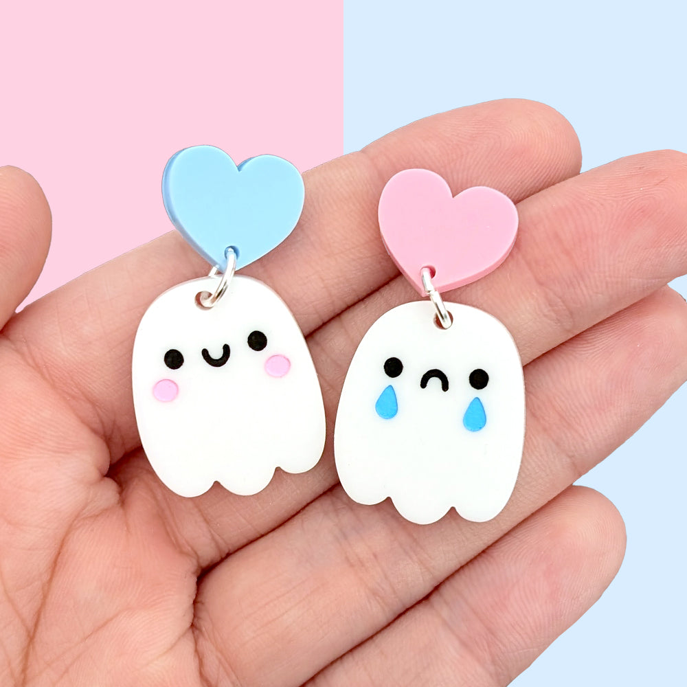 The mixed pair features both a happy and sad ghostie with quirky mismatched colouredĀ heart toppers (pink for sad and blue for happy). The single design pairs have heart studs to match their design, pink for happy and blue for sad.